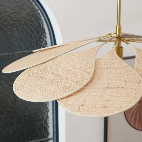 The unique pairing of metal and fabric creates an ethereal and floral suspended design. Inspired by classic louvered ceiling fans. the designer incorporates a sleek. teardrop-shaped petal. This pendant delicately diffuses light. providing a soft clarity in the room and casting delicate shadows on the ceiling.